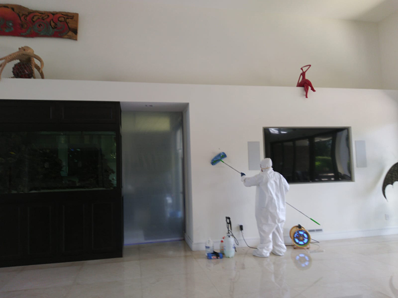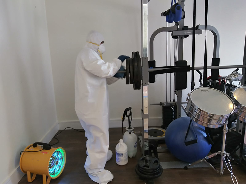 A technician disinfects a home gym from viruses and harmful bacteria.