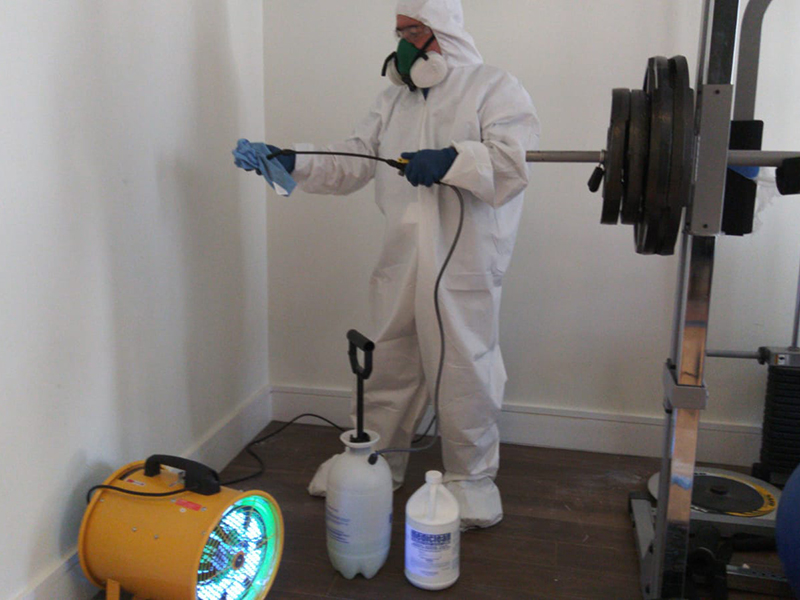 A technician disinfects a home gym from viruses and harmful bacteria.